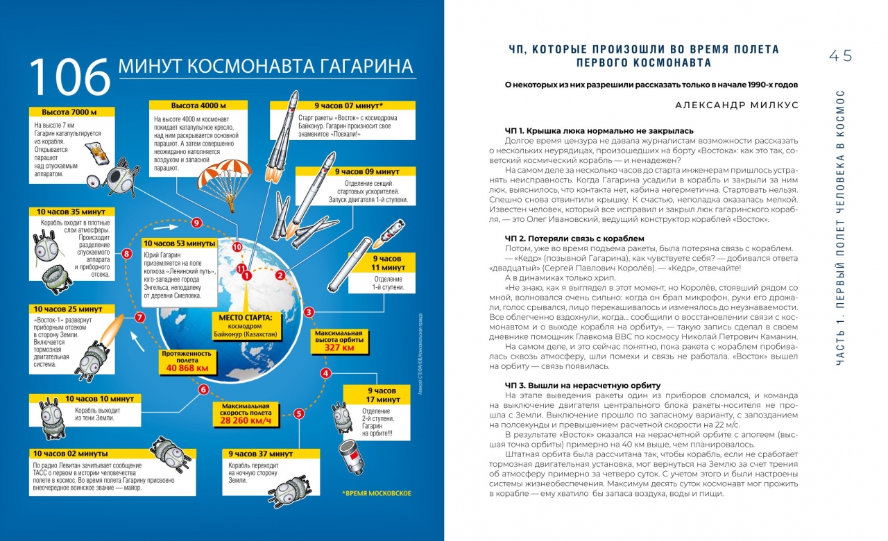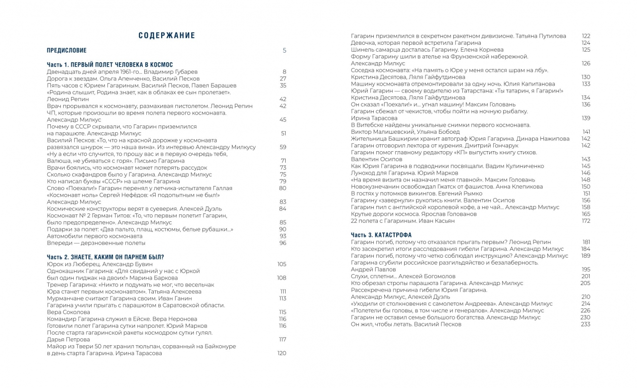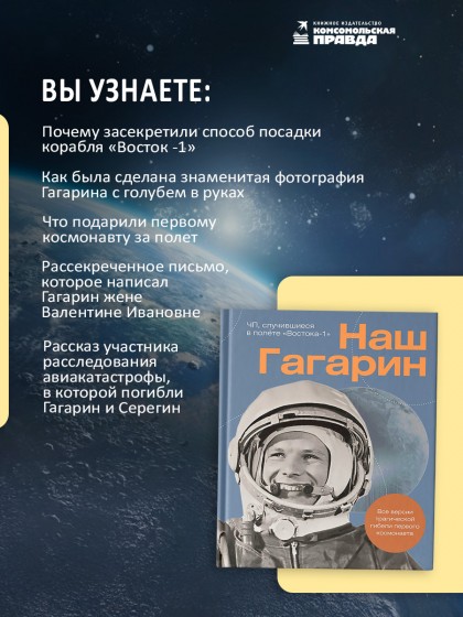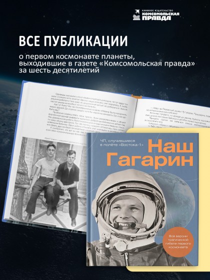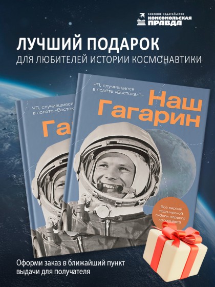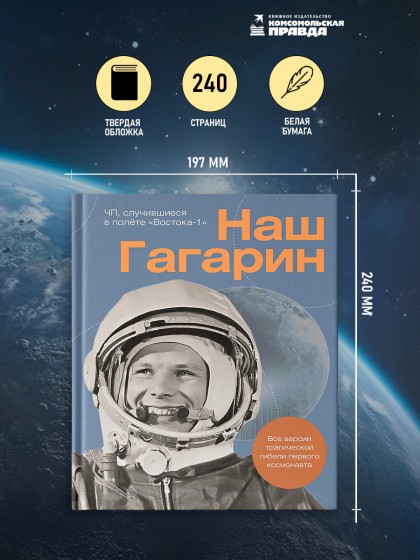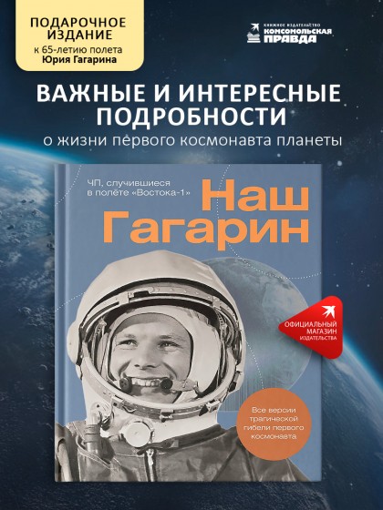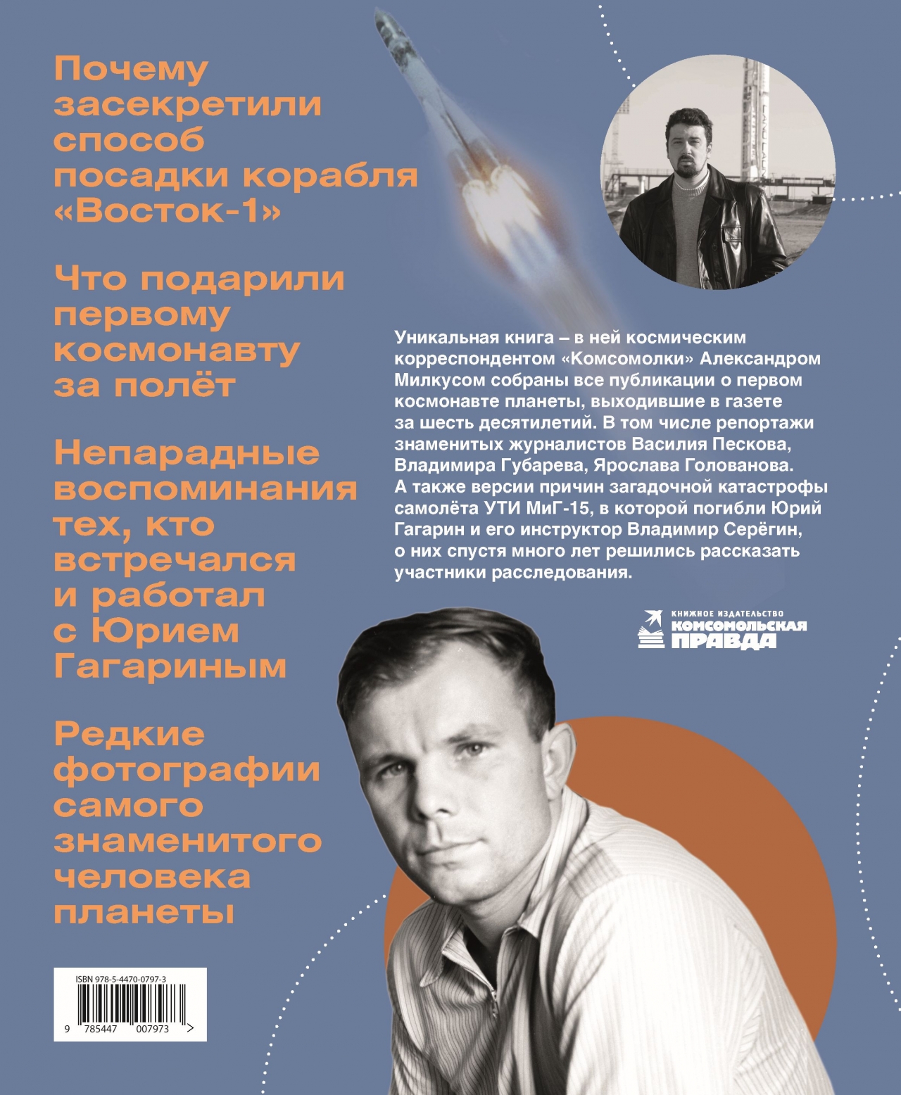 Первый космонавт, человек-легенда. За 65 лет, прошедших после первого полёта в космос, мы, казалось бы, знаем о Юрии Гагарине всё. На самом деле и великий полет, и личность Гагарина до сих пор раскрывается с новых неожиданных сторон. Из этой книги вы узнаете про девять ЧП, случившихся в полете «Востока-1»; почему засекретили место и способ посадки; что подарили космонавту за полет; а также все версии трагической гибели. В книге собраны все публикации «Комсомолки» о первом космонавте планеты за прошедшие годы. От первого репортажа, написанного знаменитым Василием Песковым 12 апреля 1961 года и интервью Ярослава Голованова до расследований о причинах катастрофы самолета УТИ МиГ-15 27 марта 1968 года, в которой погибли Юрий Гагарин и его инструктор Владимир Серегин, подготовленных уже в новом веке. Читателя ждут воспоминания о встречах с Юрием Алексеевичем, любительские фото и истории, описанные в официальной биографии космонавта.