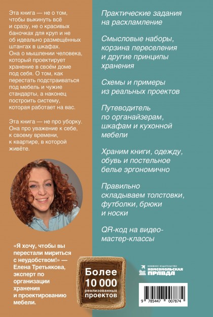 Вы разберетесь, где скрываются ошибки планировки, почему порядок не удерживается сам по себе и как даже небольшую квартиру превратить в пространство, где легко дышится. В книге нет общих советов и теорий — только практические принципы, четкая логика, схемы и примеры из реальных проектов. Бонус — видеоуроки по складыванию вещей и наглядные иллюстрации систем хранения: от книг, кухонных полотенец, постельного белья до лекарств, украшений и многого другого.