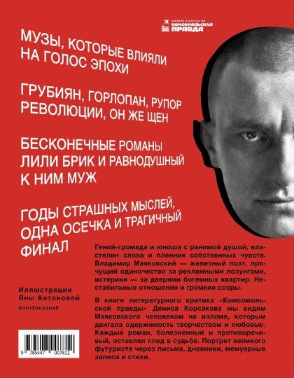 Гений-громада и юноша с ранимой душой, властелин слова и пленник собственных чувств. Владимир Маяковский — железный поэт, прячущий одиночество за рекламными лозунгами, истерики — за дверями богемных квартир. Нестабильные отношения и громкие ссоры подпитывали его талант и приближали к трагическому исходу. В книге литературного критика «Комсомольской правды» Дениса Корсакова мы видим Маяковского человеком на изломе, которым двигала одержимость творчеством и любовью. Каждый роман, болезненный и противоречивый, оставлял след в его судьбе. Портрет великого футуриста по письмам, дневникам и мемуарным записям. А современные иллюстрации художницы Яны Антоновой к стихам делают классику и сложную историю жизни поэта ближе к сегодняшнему читателю.