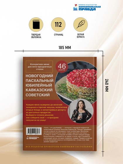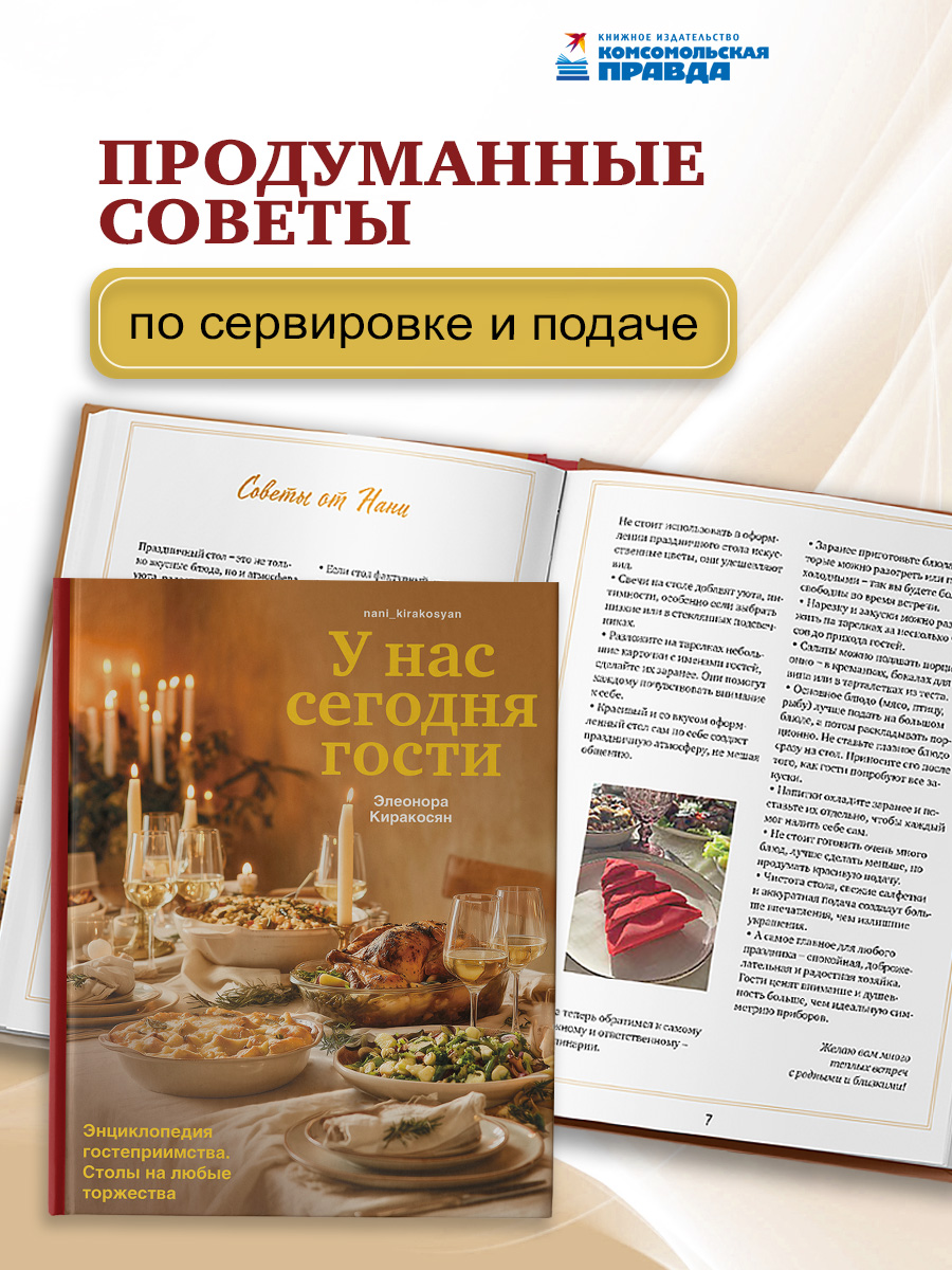 Искусство гостеприимства бесценно. Для популярного кулинара Нани Киракосян принимать гостей и накрывать щедрый стол — настоящее призвание. На страницах этой книги она делится секретами безупречных застолий, которые точно захочется повторить. Меню для пяти самых популярных поводов — Нового года, юбилея, Пасхи, кавказского ужина или ретро-праздника в советском стиле. Каждое из них продумано до мелочей и включает блюда на любой вкус: салат «Оливье», ароматный жульен, рулет из свиной вырезки с грушами и сыром, запечённые перепёлки, сациви, нежная пахлава, торт-эклер «Крокембуш» и многое другое сытное, красивое и, главное, по-домашнему вкусное. Присоединяйтесь к этому празднику вкуса и гостеприимства, и ваш стол засияет радостью.