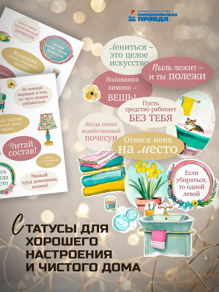 Ироничные и полезные фразы напомнят, что уборка – это не подвиг, а часть жизни, которую можно делать с улыбкой. Приклеивайте их на холодильник, кухонную и хозяйственную утварь, ноутбуки или блокноты. Или просто заклейте пятно, не забывая о главном: сковородки не должны сиять ярче вас!