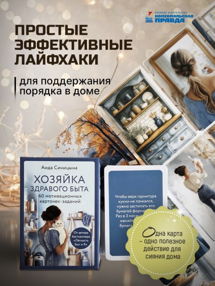 «Хозяйка здравого быта» – это первая в России колода карт, которая поможет поддерживать порядок в доме и существенно облегчит быт. Создатель колоды – эксперт по клинингу №1 в России с 20-летним опытом Аида Синицына, автор бестселлера «Легкость Быт и Я» и популярного блога aida_prodom. Автор убеждена, что уборка может быть легкой, когда знаешь, чем и как убирать. Каждая из 60-ти карт, которая вам выпадет, даст полезную подсказку по уборке квартиры, наведению порядка в доме. Колода карт поможет превратить рутинный процесс наведения чистоты в полушутливый и ненапряжный. Приглашаем вас в мир легкой уборки. Колода «Хозяйка здравого быта» станет отличным подарком маме, сестре или подруге. Красочные иллюстрации поднимут настроение прямо с утра и весь день пройдет легко и красиво!