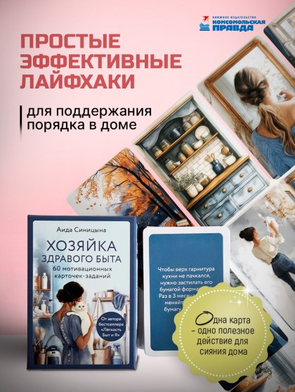 «Хозяйка здравого быта» – это первая в России колода карт, которая поможет поддерживать порядок в доме и существенно облегчит быт. Создатель колоды – эксперт по клинингу №1 в России с 20-летним опытом Аида Синицына, автор бестселлера «Легкость Быт и Я» и популярного блога aida_prodom. Автор убеждена, что уборка может быть легкой, когда знаешь, чем и как убирать. Каждая из 60-ти карт, которая вам выпадет, даст полезную подсказку по уборке квартиры, наведению порядка в доме. Колода карт поможет превратить рутинный процесс наведения чистоты в полушутливый и ненапряжный. Приглашаем вас в мир легкой уборки. Колода «Хозяйка здравого быта» станет отличным подарком маме, сестре или подруге. Красочные иллюстрации поднимут настроение прямо с утра и весь день пройдет легко и красиво!