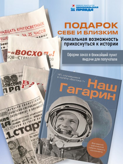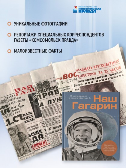 Первый космонавт, человек-легенда. За 65 лет, прошедших после первого полёта в космос, мы, казалось бы, знаем о Юрии Гагарине всё. На самом деле и великий полет, и личность Гагарина до сих пор раскрывается с новых неожиданных сторон. Из этой книги вы узнаете про девять ЧП, случившихся в полете «Востока-1»; почему засекретили место и способ посадки; что подарили космонавту за полет; а также все версии трагической гибели. В книге собраны все публикации «Комсомолки» о первом космонавте планеты за прошедшие годы. От первого репортажа, написанного знаменитым Василием Песковым 12 апреля 1961 года и интервью Ярослава Голованова до расследований о причинах катастрофы самолета УТИ МиГ-15 27 марта 1968 года, в которой погибли Юрий Гагарин и его инструктор Владимир Серегин, подготовленных уже в новом веке. Читателя ждут воспоминания о встречах с Юрием Алексеевичем, любительские фото и истории, описанные в официальной биографии космонавта.