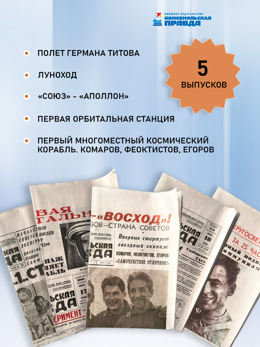 В комплект включены выпуски репринтов "Комсомольской правды": 08.08.1961 г. Полет Германа Титова.