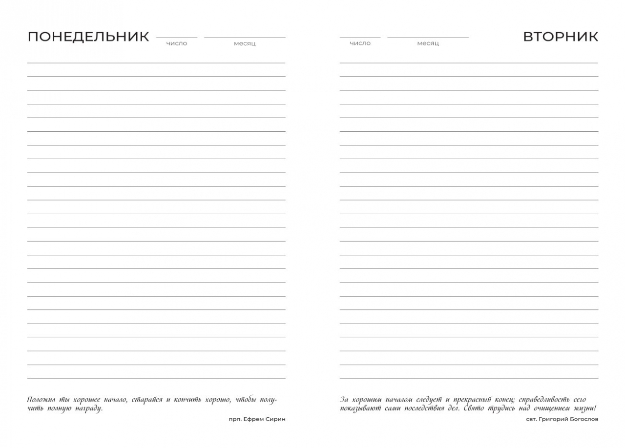- Удобство планирования с пользой для души. Сочетает функционал ежедневника (место для даты, числа, записей) с духовным содержанием, помогая планировать дела в согласии с христианскими ценностями.