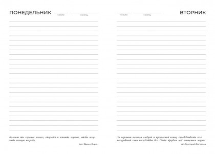 - Удобство планирования с пользой для души. Сочетает функционал ежедневника (место для даты, числа, записей) с духовным содержанием, помогая планировать дела в согласии с христианскими ценностями.