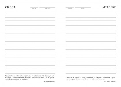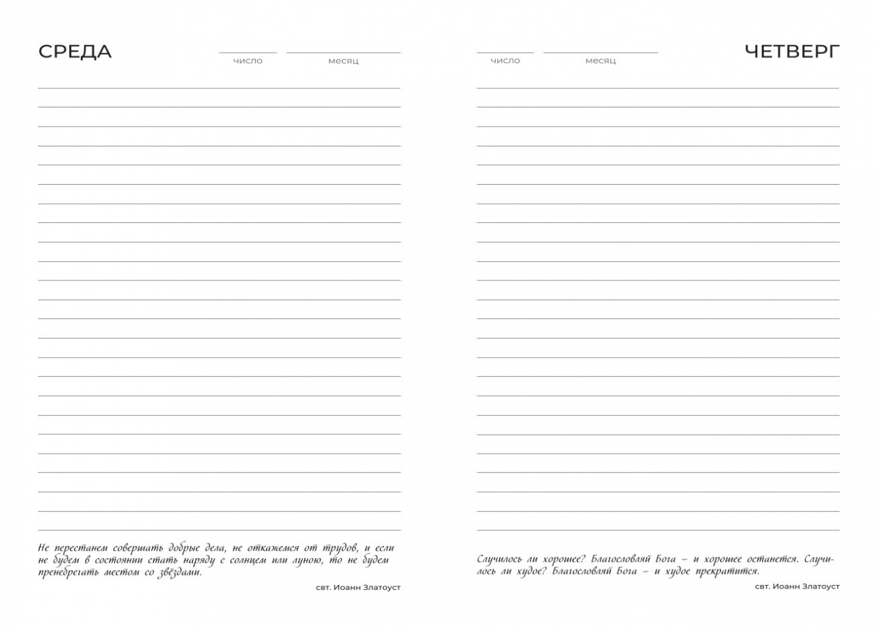 - Удобство планирования с пользой для души. Сочетает функционал ежедневника (место для даты, числа, записей) с духовным содержанием, помогая планировать дела в согласии с христианскими ценностями.